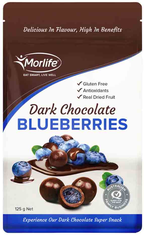 Experience our dark chocolate super snack. Morlife has created the ultimate indulgence, with plump dried blueberries coated in premium dark chocolate, combining a deliciously decadent treat. Blueberries never tasted so good.