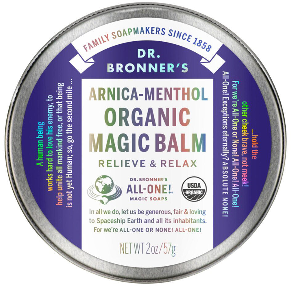 Dr. Bronner's Arnica-Menthol Organic Magic Balm helps cool and soothe sore muscles and achy joints with a potent blend of arnica, camphor, menthol and peppermint oils. Our base of organic beeswax and organic oils ‐ avocado, coconut, olive, jojoba and hemp ‐ nourish and moisturise skin with no synthetic ingredients ‐ none!